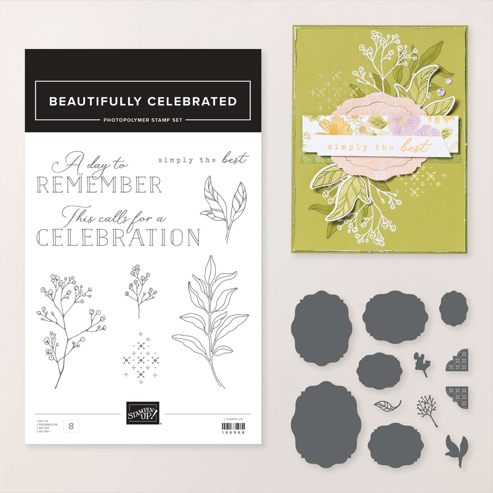I stamped the large three leaf image from the Petals of Beauty stamp set onto Basic White card using Old Olive ink. I cut out all of the images using the co-ordinating Petals of Beauty Dies. The images are all attached to the card front using dimensionals. I stamped the greeting from the Words of Beauty stamp set onto Basic White card using Early Espresso ink. I cut out the greeting using one of the banners from the Words of Beauty Dies.