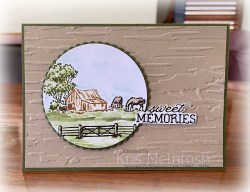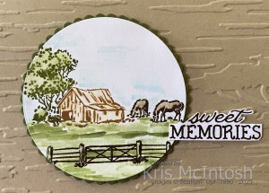 I stamped the horse image from the Unbridled Beauty stamp set beside the house image using Early Espresso ink. I used a Blender Pen to colour the tree, house and horse images. I also used a Blender Pen to add Mossy Meadow ink below the stamped images and Balmy Blue ink around the top of the images. I used the largest circle from the retired Layering Circle Dies to cut out the image. I cut Mossy Meadow card using the largest scalloped circle from the retired Layering Circle Dies. Before attaching the stamped circle to the scalloped circle I stamped the fence image from the Unbridled Beauty stamp set across the bottom of the circle using Early Espresso ink.
