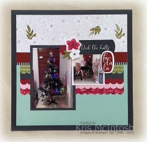 I didn’t really change anything on the pages, except I used an Dark Old Olive Stampin’ Blend instead of a Blender Pen to colour a few of the leaves on the Designer Series Paper before covering them again withWink of Stella. I also added a greeting from the Celebrate Together stamp set onto the journaling panel using Memento Tuxedo Black ink. I am very happy with this page and very happy with the tree. Not long ’til Santa arrives now!