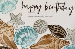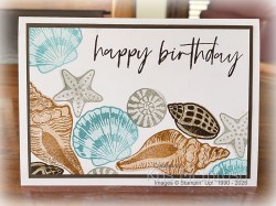 Today I have another card I created using the Shell Collecting stamp set. For this card, I used lots of stamps and lots of colours to add the images to the Basic White panel. The large shells are stamped in Pecan Pie with the solid image stamped onto scrap paper first. The blue shells are stamped in Balmy Blue with the solid image stamped onto scrap paper first.