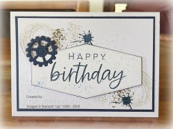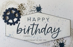 Today’s card is one I created using the Gears & Textures Bundle. I used the circle/dotted die from the Gears & Textures stamp set and Gray Granite ink to stamp twice onto Basic White card. I used the dotted image to stamp onto the Basic White card twice full strength and twice second generation. I also added the solid splash image from the Gears & Textures stamp set twice onto the card using Night of Navy ink. I attached the stamped panel to Night of Navy card. I stamped “happy birthday” from the With You in Mind stamp set onto Basic White card using Night of Navy ink.