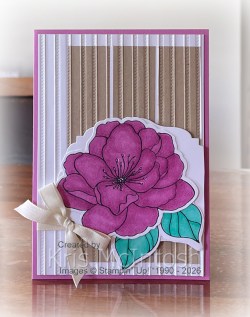 Today I have another card to share using the Simply Beautiful Bundle which is available now in the 2026 January to April Mini Catalogue. I attached three strips of Crumb Cake card to the right hand side of Basic White card. The panel is embossed using the Lovely Stripes Embossing Folder. I wrapped the bottom of the embossed panel using Basic Beige 3/8″ Classic Ribbon. The whole panel is attached to scored and folded Petunia Pop card. I cut Basic White card using one of the dies from the Beautifully Celebrated Dies (also in the 2026 January to April Mini Catalogue).