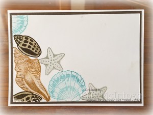 The star fish are stamped in Smoky Slate with the solid image stamped onto scrap paper first. The small dark brown shell is stamped with Crumb Cake in for the solid image and Early Espresso for the detailed image. The round shell is also stamped in Smoky Slate ink with the solid image stamped off first.