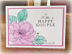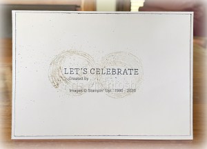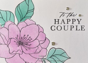 The leaf images are cut out using the co-ordinating Petals of Beauty Dies. I layered the die cut images onto the smaller panel stamped with the Lasting Linen Background adding dimensionals underneath the two flowers. I stamped the greeting from the Words of Beauty stamp set onto Basic White card using Gorgeous Grape in and cut it out using one of the banners from the Words of Beauty Dies. The greeting is attached across the floral images using dimensionals where necessary. I coloured two large and three small Basic Pearls (retired) using the Dark Highland Heather Stampin’ Blend. The large pearls are attached to the centre of the flowers and the small pearls around the images. To decorate the inside of the card, I stamped the smaller three leaf image from the Petals of Beauty onto Basic White card using Lost Lagoon ink. The solid image is stamped onto scrap paper first. I created another large flower as I did for the card front and attached it over the stamped leaf. I stamped “celebrate” from the Banner Sayings stamp set beside the flower using Gorgeous Grape ink. I love how pretty this card is, don’t you?
