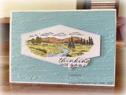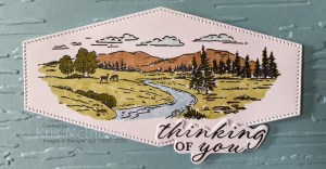 I cut pieces of the Painted Illusions Designer Series Paper so that they would run across the scored card base. I cut Basic White card twice using one of the Textured Notes Dies (last chance). I inked the “You’re on my mind” section of one of the stamps from the Friendly Foliage stamp set using Pretty Peacock ink and stamped it onto the bottom of one of the Basic White rectangles.
