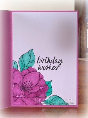 I coloured the flower using Petunia Pop Stampin’ Blends and the leave image using Summer Splash Stampin’ Blends. I used the co-ordinating Simply Beautiful Dies to cut out the flower and the leaves before attaching them to the card front. I tied a bow using the Basic Beige 3/8″ ribbon and attached it to the card front using a Glue Dot. To decorate the inside of the card I stamped the large flower from the Simply Beautiful stamp set onto the lower left hand corner of Basic White card using Memento Tuxedo Black ink. I masked the image and stamped the double leaf image on either side of the flower. I removed the mask and coloured the flower using Petunia Pop Stampin’ Blends and the leaves using Summer Splash Stampin’ Blends. I stamped the greeting from the Simply Said stamp set beside the greeting using Memento Tuxedo Black ink. I love how this card turned out, don’t you?