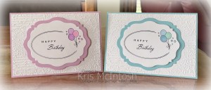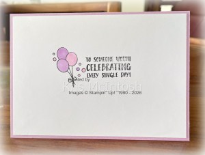 I coloured the balloons using Fresh Freesia and Bubble Bath Stampin’ Blends. I cut out the image using a slightly smaller die from the Beautifully Created Dies. To decorate the inside of the card I stamped the greeting from The Right Words stamp set onto Basic White card using Memento Tuxedo Black ink. I stamped the balloon image next to the greeting using Memento Tuxedo Black ink. The image is also coloured using the Fresh Freesia and Bubble Bath Stampin’ Blends.