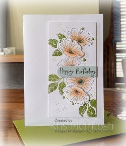 I stamped “congrats” from the Retreat stamp set onto one of the die cut banners using Memento Tuxedo Black ink which I attached below the floral image. I also added three Old Olive Moody Palette Glossy Dots to the card front. To decorate the inside of the card I stamped the lined border image from the Retreat stamp set across the bottom of Basic White card using Old Olive ink. I also stamped “happy birthday” from the Retreat stamp set using Memento Tuxedo Black ink. So happy with this card and so glad I didn’t have to do any fussy cutting for the floral image. I am slowly getting through the remaining pieces from the Virtual Retreat.