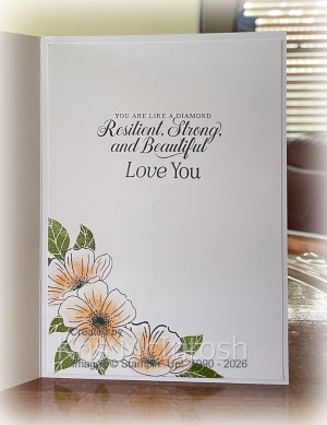 I also added a strip of Old Olive Two-Tone paper across the top of the Designer Series Paper. I used one of the die cuts in the Retreat to stamp the floral image from the exclusive 2026 Virtual Card Making Retreat stamp set using Memento Tuxedo Black ink. I coloured the image using Highland Heather and Old Olive Stampin’ Blends. I attached floral image to the card front using dimensionals.