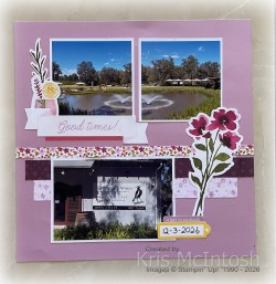 I don’t think it matters that much. I did stamp a greeting from the Lovely Florals (last chance) stamp set onto the right hand page using Blackberry Bliss ink. I so love having these pages ready to go when I find the right photos.