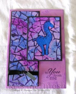 This is a card I came up with using this technique. It uses a stampset from the new Summer Mini – Animal Stories. The background is created using the Stained Mosaic technique. Now we will not be making this particular card but I thought I would post this one so that you can see what it is we be learning.