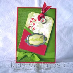 Sandi used a stampset which is not available in Australia so I improvised. I used Fresh Cuts. Now this is a stampset that I bought when the new catalogue came out and have hardly used. However, I am more than happy with how this card turned out. I followed her instructions to create the tag substituting my colours (Riding Hood Red, Old Olive and Very Vanilla) and stamps. It has actually inspired me to think about using a tag as the main feature on more of my card creations. I am not going to give you step by step as you can just follow Sandi’s tutorial.