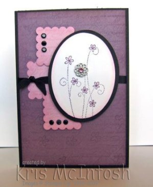 I stamped the image from Simply Said onto Whisper White card using Basic Black ink. I coloured the flowers using my blender pen and Pale Plum ink. I added a Filigree DesignerFlower with a pink Rhinestone brad through the centre. I also sponged the edges with Pale Plum ink. This layer was then added to the black layer using dimensionals and then added to the card using double dimensionals so that it would sit above the Scallop Squares.