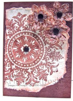 I started with Close to Cocoa card. I stamped it with the Sanded Background using Versamark ink. Then I stamped it with the En Francais Background using Close to Cocoa ink which I stamped off once first. Then I sponged the edges using Close to Cocoa ink. Next I stamped onto Very Vanilla card using the Sanded Background and Versamark ink and then overstamped with the En Francais Background using Close to Cocoa but only finger walking the impression so that it was faint and haphazard onto the card. I stamped the Medallion Background stamp over the top using Close to Cocoa ink and making sure that I had stamped off the left hand side of the card. Then I tore around the Medallion shape, inked the edges with Close to Cocoa ink and distressed the edges using the distressing tool from the Cutters Kit. This piece was then attached to the base Close to Cocoa card. I stamped the Medallion again onto scrap Very Vanilla Card and punched out the centre using the 1 3/4″ circle punch. I scrunched the circle up and distressed the edges before inserting a 5/16″ Chocolate Chip Jumbo brad into the centre. I attached this to the centre of the medallion using a dimensional. I stamped the large flower from the Vintage Vogue stampset onto Very Vanilla card 3 times using Close to Cocoa ink and cut them out. I also stamped the small flower from Vintage Vogue onto Very Vanilla card using Chocolate Chip ink 3 times and cut them out. I shaped the flowers slightly and then scrunched them all up into tight balls before flattening them out, layering then together and adding 5/16″ Jumbo Chocolate Chip brads through the centre of the 3 flowers. These were attached to the top right hand corner, one with a Mini Glue Dot one with a Dimensional and one with a Pop-Up Glue dot.