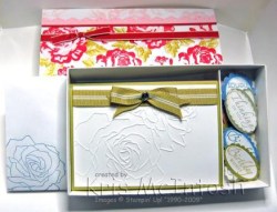 I have used the Pink Pirouette Roses from the Bella Blue Designer Series paper to cover the outside of the box. I then made a focal strip using A Rose is a Rose Stampset and Pink Pirouette, Riding Hood Red and Kiwi Kiss inks. This piece was wrapped with Red Riding Hood Tafetta Ribbon.