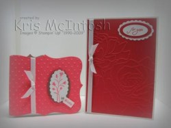 Firstly I wanted to share these two cards with you. I was asked to “do some craft” at a recent Fishing Week event Ron and I attended. Since Ron won’t let me take lots of “craft stuff” with me I had to do a bit of the work at home and keep the cards fairly simple. The card on the left is done with the Top Note Die and the Big Shot. The base card is Close to Cocoa which was cut so that it folds and the then a Top Note layer of Cameo Coral was added. This layer is actually cut down and then run through the Big Shot with the Perfect Dots Embossing Folder and wrapped with Whisper White grosgrain before attaching to the Close to Cocoa layer. An image from Pocket Silhouettes was stampped onto Whisper White card using Cameo Coral ink and punched out with the Scallop Oval Punch. A Close to Cocoa Wide oval was added underneath. A greeting was stamped from Tiny Tags was stamped onto Whisper White card using Cameo Coral ink, punched out with the Medium Jewellery Tag punch and attached to the Scallop Oval using a silver brad. This piece was then attached to the card front using dimensionals. The card on the right has a Whisper White card base. On top of this is a piece of Ruby Red card which has been run through the Big Shot using the Manhatten Embossing Folder, again this is wrapped with some Whisper White grosgrain ribbon. The greeting is some Sincere Salutations and has been stamped onto Whisper White card using Ruby Red ink, punched out with the Small Oval, layered onto a Ruby Red Large Oval and then a Whisper White Scallop Oval.
