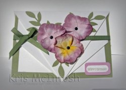 Today is my youngest daughter’s birthday and I want to share with you the card that I made for her. The pansies made with the butterfly punch are all over the internet so I thought that I would try and make some. I followed several different tutorials, all you have to do is google “butterfly punch pansies” and you will have your choice of several. I had also seen a card by on Valita’s blog which I thought was just gorgeous so I followed her video tutorial and this is the finished card.