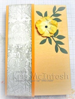 This is the front of the Holder.  I experimented before the class with several different ways of colouring my pansies and was happiest with the result when I used my Stampin’ Write Markers.  So how do you make the pansies?  Well you punch two butterflies from Whisper White card using the Butterfly Punch.  You take two makers (in the case of the Holder I used Barely Banana and Summer Sun) and using the lightest first you colour from the centre of the butterfly out towards the edge of the wings and then you take the darker marker and colour just on the edges of the wings.  The next thing you have to do is spritz the butterflies with water and then you scrunch the butterflies up into the smallest ball you can, and then very carefully open them up.  You do have to be very careful at this stage as you can quite easily tear the butterfly in half (speaking from experience here).   You do not flatten the butterflies but leave them slightly scrunched and let them dry.  I use my heat gun to hurry this up a bit.  Once the butterflies are dry you punch a hole in the centre of each butterfly and attach them together with a brad.   Very simple but very effective.  I love the way each one turns out quite different to the last.