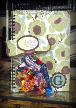 I found these little notebooks with hardcovers which I thought would be the right size for taking notes at Regionals and recovered them using the Greenhouse Gala Designer Series Paper.  I recovered 4 of these and one for myself using the different prints in this Designer Series.   Each one has the recipients initial on the front.  I also added Designer Paper to the pens so that they would match the books.   Of course no gift would be complete without chocolate, so I used the medium cellophane bags that Stampin’ Up! sells filled them with chocolates and made toppers using the Big Shot,  Top Note Die, Designer Series Paper and co-ordinating cardstock.  The greeting is from Great Friends and I also used the flower from Friends Never Fade.  I cut the Chocolate Chip cardstock using the Lots of Tags Die and punched the greeting out using the Wide Oval Punch.