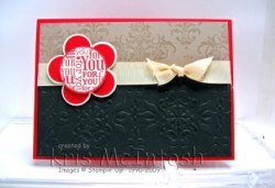 I really like the colours in this card and must admit I have used them a lot lately. I ran the piece of Basic Black cardstock through the Big Shot using the Vintage Wallpaper Embossing Folder and layered it onto a piece of Crumb Cake card which I had stamped with the large filigree diamond from the Friends 24-7 stampset using versamark ink. The Very Vanilla 5/8″ grosgain ribbon was tied around this piece. I then punched out an Fancy Flower from Very Vanilla card. I layered this with 5 3/4″ circles punched from Real Red card. I stamped the For You Flower onto Very Vanilla card using Real Red ink and punched out the centre using the 1 3/8″ circle punch and attached it to the flower over the 3/4″ circles using dimensionals. The whole flower was then attached to the front of the card again using dimensionals. I am really loving this single stamp.