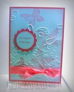 I stamped the butterfly from Great Friend onto Whisper White card using Pretty in Pink ink. Then I ran the cardstock through the Big Shot using the Elegant Lines embossing folder. I wrapped the card with Pretty in Pink Satin Ribbon and then attached it to a Pretty in Pink base card. “Life Happens, Love Helps” is from Vintage Vogue and I inked it using my Pretty in Pink Stampin’ Write Marker and stamped onto Whisper White card which was punched out using the 1 3/8″ circle punch. I sponged the edges with Pretty in Pink ink and layered it onto a Scallop Circle of Pretty in Pink card. I love how simple and elegant this card it.