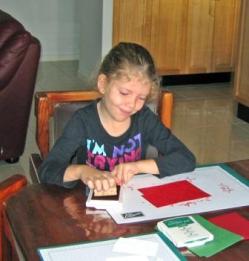 Here is Abigail hard at work.  At almost six she is starting to show real artistic talent.  She expressed the view the she liked the Real Red/ Garden Green combination much more than the Cherry Cobbler/Old Olive combination.  Abigail has already expressed the desire to be a Stampin’ Up! Demonstrator when she grows  up just like her Mum and her Nan.  God bless her, mmm… wonder when I can sign her up!