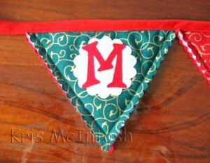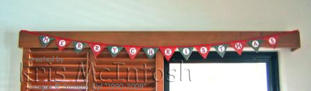 I bought my material as “fat quaters” from Spotlight and using the Big Shot and the Pennant Die cut out the small pennant using plain red material for the back, and alternating red and green for the front. I also cut double sided iron on wadding to attach the front pennant to the back pennant. I cut the scallops using some shimmery white material and used double sided iron on paper to attach them to the pennants. I attached the plain red material to the iron on double sided paper and then cut them using a sizzix alphabet die which I have had for a long time. Once I had the individual pennants together, I used my sewing machine to sew around the edges to hold everything together. I attached all the pennants to red bias binding 25mm wide and then hung it over the sliding door.