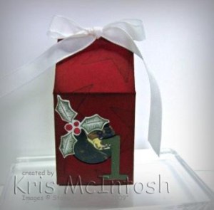 Sharron has had the Milk Carton die for a while and wanted me to demonstrate some of the ways to use it. So I demonstrated this cute little double milk carton carrier that I found on Elizabeth Hurst’s blog. I used Old Olive card for the Milk Carton and stamped it with my So Swirly jumbo wheel using Old Olive ink. After assembling the box, I added the flower from Season of Joy which was stamped in Cherry Cobbler onto Whisper White card and cut out. I also stamped one flower using Old Olive ink, cut it out and then cut it in half to add leaves to my flower. These were attached using mini glue dots and I also added a small Clear Rhinestone to the centre of the flower. Lastly we added a clip from the Clips Assortment to close the carton.