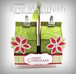The box is Cherry Cobbler cardstock (all the dimensions for this are on Elizabeth’s blog). I used a strip of striped Designer Paper from the Jolly Holiday series to wrap about the box and added a label cut using Whisper White card, the Big Shot and the Lots of Tags sizzlet. I used my Cherry Cobbler marker to ink the Merry Christmas (from Season of Joy) and stamped it onto the tag, which is attached to the box to cover the join in the designer series paper. The last touch was a piece of Old Olive Satin ribbon tied through the handle of the carrier.