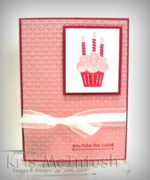 The cupcake from the Party Hearty stampset sprang to mind (maybe because it is about the only set I have that portrays something sweet). Anyway I inked the cupcake using my Rose Red and Blushing Bride Stampin’ Write Markers and stamped onto Whisper White card. I masked the cupcake and stamped the candle 3 times again using my Rose Red and Blushing Bride Stampin’ Write Markers to ink them up. Next I took my Two-Way glue pen and coloured in the icing and the candle flames. Then into the Dazzling Diamonds to add a lovely touch of bling. I layered the image piece onto Rose Red Card. I stamped the “you take the cake!” from Party Hearty using Rose Red ink and then ran it through the Big Shot using the soon to be released Square Lattice Embossing Folder and wrapped it with the beautiful Whisper White 5/8″ Organza ribbon. The base card is Rose Red card.