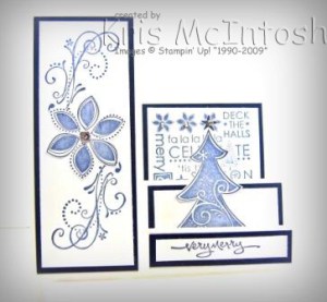 I stamped the small swirl from Priceless onto Whisper White card using Night of Navy ink on the long panel, once at the top and once at the bottom. I then stamped the flower from Season of Joy onto Whisper White card using Night of Navy ink and cut it out. I added it to the long panel over the swirls and added a large Basic Rhinestone. The “very merry” is from Short and Sweet which has also been stamped using Night of Navy ink onto Whisper White card before attaching to the front step. The tree from Season of Joy has been stamped using the same ink onto Whisper White card and cut out before it was attached to the middle step. The tree has a small Basic Rhinestone in the centre of the star. The “wordy” stamp from Season of Joy has been stamped onto Whisper White card using the Night of Navy ink and attached to the last step. I’ve added small Basic Rhinestones to the 3 poinsettias at the top left of the image.