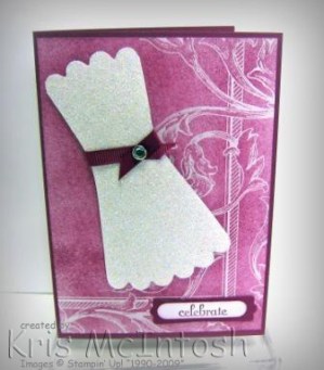 My base card is Rich Razzleberry and I added a layer of the gorgeous new Presto Patterns Specialty Designer Series Paper. This paper comes White and is embossed with different designs and you just add ink to create paper anyway you want. For this one I sponged on Rich Razzleberry ink until I was happy with the depth of the colour and the pattern emerged. I think this paper is going to become a bit of a favourite of mine. I ran Whisper White card through the Big Shot using the Scallop Circle Bigz Die and then cut out the dress shape. I covered the card with Versamark ink and then used a combination of Heat & Stick Powder and Dazzling Diamonds to emboss it to get this marvelous glittery dress. I wrapped a small piece of Rich Razzleberry 1/4″ grosgrain ribbon around the waist and added a Clear Rhinestone to hold it. The dress is attached to the card using dimensionals. I stamped “celebrate” from the Fabulous Phrases stampset onto Whisper White card using Rich Razzleberry ink and punched it out using the Word Window Punch and sponged the edges with the same ink. I layered this onto a Modern Label punched from Rich Razzleberry ink and attached it to the bottom right hand corner of the card.