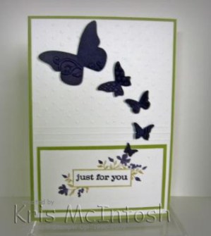 I started by embossing the top section of my Whisper White card with the Perfect Polka Dots embossing folder.  Now what I like about this is that although I only embossed half of the piece of card, I didn’t get that line that you get from the embossing folder when you run it through the Big Shot.  I added 3 score lines underneath my embossing – just because I liked the look.  I inked my image from the Just Believe stampset using my Pear Pizzazz and Concord Crush Stampin’ Write Markers  and stamped it onto Whisper White card.  “Just for You” was stamped using Concord Crush ink and the stamp-a-ma-jig to get it straight.  I added a layer of Pear Pizzazz and attached it to the bottom section of my embossed Whisper White card.  This was then layered onto my Pear Pizzazz base card (I really love these two colours together).  I cut Concord Crush card using the Big Shot and the Beautiful Wings Embosslit.  I attached the butterflies to the front of the card,  and there you have it.   My first share that wasn’t Christmas in a while.