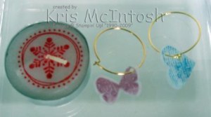 To make the wine glass charms I stamped a butterfly image from Butterfly Prints  using Rich Razzleberry ink and the heart from Punch Potpourie (Level 1 Hostess Set) using Pacific Point ink onto Shrink Plastic.  I punched a hole in each one using the largest hole punch on the Crop-a-Dile.  Once they were shrunk I added the little gold rings which I purchased at Spotlight.  I stamped the snowflake image from Season of Joy onto tissue paper, pierced a hold through the centre to take the wick and then used my heat gun to set the image into the top of the candle.