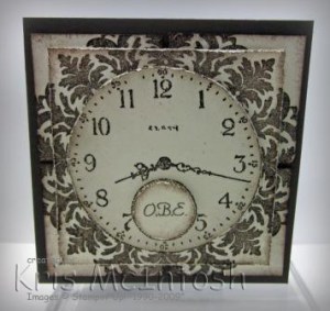 I find it rather hard to make male cards, but I did want this one to be special.  I started with Early Expresso card which is 22cm x 11cm scored and folded in half.  I stamped the Medallion Background onto a 10cm square piece of Confetti Cream card using Early Expresso ink and then cut it into 4 5cm square pieces.  I sponged each edge of the four pieces with Early Expresso ink and then attached them to the front of the card.  I stamped the Medallion Background onto a 9cm square piece of Confetti Cream, again using Early Expresso ink.  I sponged the edges with the same ink and then distressed the edges using the tool from the Cutter Kit.  I added this to the card using dimensionals.  I stamped the image from Sense of Time onto a piece of Confetti Cream using Early Expresso ink and cut it out.  Again I sponged the edges with  Early Expresso ink and distressed the edges.  I added it to the front of the card using dimensionals.  I printed the O.B.E. onto Confetti Cream card using my computer and matching the ink colour to Early Expresso.  I punched this out using the 1″ circle punch and sponged and distressed the edges before adding it to the card front with dimensionals