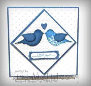This is my version of the card. I started with Marina Mist card 12cm x 24cm scored and folded to make a 12cm square card. Unfortunately this will not post but I will hand deliver this, probably give it to my hubby for Valentines. I added a layer of Whisper White card which I embossed using the Perfect Polka Dots Impression Folder. The next layer of Marina Mist card is 8cm. The Whisper White card square (7.5cm square) has been embossed using the Square Lattice Embossing Folder. I punched one bird and two wings from Marina Mist card using the Two-Step Bird Punch. Then I stamped the bird from Punch Potpourri (Level 1 Hostess set) using Marina Mist ink onto Whisper White card and punched it out using the Two-Step Bird Punch. I sponged the edges of the two birds and the wings using Marina Mist ink and added them to the card front. I punched the smallest heart using the Heart to Heart Punch from Marina Mist card. I stamped “love you” from the Short and Sweet stampset using Marina Mist ink on Whisper White card and punched it out using the Word Window Punch. I attached this to a Marina Mist Modern Label and added it to the card.