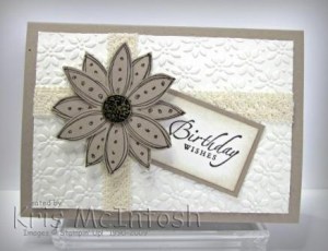 I used another stampset which I have hardly ever used…Scribble This and Crumb Cake, a colour I am fast becoming addicted too. My base card is Crumb Cake. The Very Vanilla layer has been embossed using the Petals A Plenty Embossing Folder. Before attaching this layer to the card base I wrapped it with the gorgeous Victoria 5/8″ Crochet Trim. I stamped the flower from Scribble This twice onto Crumb Cake card using Early Expresso ink and cut them out. I stamped “birthday wishes” from Sincere Salutations onto Very Vanilla card using Early Expresso ink and sponged the edges using Crumb Cake ink, then added a layer of Crumb Cake card. I stacked the flowers onto the greeting piece, pierced a hole and inserted one of the absolutely gorgeous Vintage Brads through the centre. I used Mini Glue dots to attach this to the card front. I loved Gretchen’s card and I absolutely love this one as well. It is so simple and oh so beautiful.