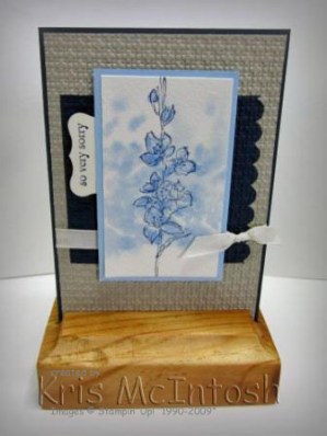 I started with Night of Navy as my base card. For the next layer I cut my Night of Navy card, punched one edge with the Scallop Edge Punch and then attached it to the Sahara Sand Card. Then I ran it through the Big Shot using the Square Lattice Embossing Folder. (This technique is called Inlaid Embossing.) For my image panel I used Watercolour Paper which I spritzed with water, so it was quite damp. Then I took the “fill” stamp for the long stem flower from Fast and Fabulous, inked it with Bashful Blue ink and stamped onto the wet Watercolour paper. This makes the image “bleed” a little and give a nice soft effect. I repeated this several times to cover the Watercolour Paper. The next step requires patience (or in my case a heat gun) to allow the Watercolour paper to dry completely. Once the paper was dry, I stamped the “fill” image again using Bashful Blue ink and no water. Then I stamped the “outline” image using Night of Navy ink over the top. I love the soft dreamy effect. I layered the Watercolour paper onto Bashful Blue card. Next I stamped “so very sorry” from the Three Little Words stampset onto Very Vanilla card using Night of Navy ink. I punched it out using the Curly Label punch and adhered it behind my image panel. I used dimensionals to add the image panel to the card front.