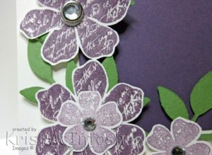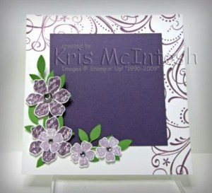 We used our Wheel Guide and our Grid Paper to line up our border and to mitre  the top right hand corner.   The 6″ x6″ card is Whisper White and we rolled it using Perfect Plum ink and the So Swirly Jumbo Wheel.  Next we added a photo frame of Perfect Plum cardstock which is cut 4 1/4″ x 4 1/4″ to matt a 4″ x 4″ photo.  The flowers are from the Vintage Vogue stampset and have been stamped on Whisper White card using Perfect Plum ink, the small flowers were stamped off once first to get a lighter shade and then cut out.  One flower has a Large Clear Rhinestone Brad through the centre and the others all  have small Clear Rhinestones in the centre.  The leaves have been cut using Wild Wasabi card and the Little Leaves sizzlit.  The leaves have been attached to the back of the flowers and then added to the page using dimensionals so that the photo can be slipped under the leaves and flowers.