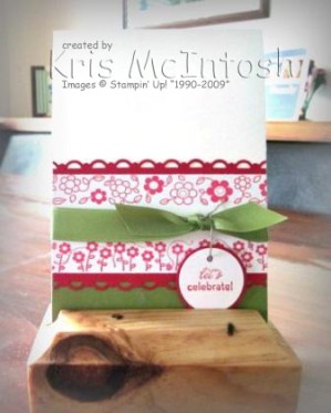 The card to CASE this week at SUDSOL used the Builder Wheels which are now available in the Summer Mini. I love the versatility of these wheels and decided to play along. I started with Whisper White card with a strip of Old Olive along the bottom edge. I built my wheel using Bees & Blossoms and Posy Party with a spacer in between. I rolled them onto Whisper White card using Real Red ink. I then wrapped my Old Olive 5/8″ Satin Ribbon between the two wheeled patterns. The Real Red layer has been punched along both edges using the Scallop Trim Border Punch before adding the image panel. I stamped “let’s celebrate” from the On Your Birthday stampset using Real Red ink onto Whisper White card and punched it out using the 1 1/4″ circle punch. I added a 1 3/8″ circle of Real Red card. I created a hole using my 1/16″ Handheld circle punch to tie the tag to the Satin Ribbon using Linen Thread.