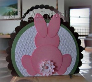 The back of the basket is decorated with a “bunny behind” which I cased from Kim Score. You might remember these bunnies from this post. All the pieces are punched from Pretty in Pink ink and sponged with the same ink. Punches used – 1 3/4″ circle (body), 1 3/8″ circle (head), small oval (ears) and Butterfly punch (cut in half for legs). I punched Whisper White card using the Boho Blossoms Punch and inked the edges of the flowers with Pretty in Pink ink. I scrunched the flowers and then stacked them adding a Pretty in Pink brad to the centre. This is attached to the bunny using a mini glue dot. I cut a 3cm strip of Chocolate Chip card and punched both edges using the Scallop Border punch. I added a .5cm strip of Pretty in Pink card to the centre and attached this to the box using Pretty in Pink brads to make a handle.