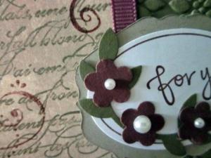 To create the greeting piece I used my Bravo Burgundy Stampin’ Write marker to ink up the oval around the “happy birthday” in the Perfect Punches stampset and stamped onto Whisper White card.  I punched the piece out using the Wide Oval punch.  I stamped “for you”  from the Great Friend  stampset inside the oval using Bravo Burgundy ink.  I attached this to a tag cut from Crumb Cake card using one of the tags from the Lots of Tags sizzlits.  I punched two sets of leaves from Soft Suede card using the Two Step Bird punch and also punched 3 flowers from Bravo Burgundy card using my Trio Flowers punch (retired).  I attached the leaves and flowers around the greeting and added two medium and one large Basic Pearl  to the centre of the flowers.  The greeting piece is attached to the card front using dimensionals.
