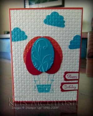 To create my balloon I stamped the image from the A Little Treat stampset using Tempting Turquoise ink onto Whisper White card. I punched two Wide Ovals from Tangerine Tango card and added them to the top of the image. I punched 3 “clouds” from Tempting Turquoise card using the Build-a-Cupcake punch (it’s the icing part of the cupcake) and attached them around the top of the card. Then I embossed this piece using the Square Lattice Embossing Folder. Next I punched two Real Red Wide Ovals and added them over the Tangerine Tango wide ovals. I also punched one wide oval from Tempting Turquoise card and embossed it with the Elegant Lines Embossing folder and attached it over the Real Red wide ovals. I stamped Happy and Birthday from the Create-A-Cupcake stampset onto Whisper White card using Real Red ink. I punched each word separately using my Word Window Punch. I then layered them onto Real Red card cut using the Modern Label Punch. I attached them to the embossed Whisper White card and trimmed them off square with the edge. Lastly I attached this whole piece to a folded Tangerine Tango base card.