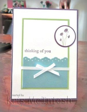 I started with a base of Perfect Plum and added a layer of Whisper White card.  The middle section of the card consists of a Layer of Pear Pizzazz.  I punched one edge of  Baja Breeze card using the  Eyelet Edge Punch and attached it to a piece of Whisper White card.  I wrapped this layer with Whisper White 1/8″ Taffeta Ribbon before attaching it to the card.   I stamped “thinking of your” from the Three Little Words stampset using Perfect Plum ink.  I inked  an image from the Silhouette Sentiments stampset using my Perfect Plum and Pear Pizzazz Stampin’ Write Markers and stamped onto Whisper White card.  I punched the image using the 1 1/4″ circle punch and added a Perfect Plum 1 3/8″ circle before attaching it to the card.  Lastly I tied a bow with Whisper White 1/8″ Taffeta ribbon and attached it to the card using a Mini Glue Dot.
