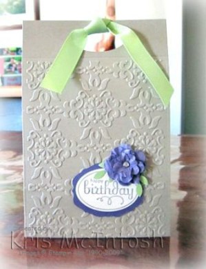 The last thing of course is how to package the present. I started with a C5 envelope (165 x 230mm) which I sealed. Then I trimmed down the length of the envelope to about 6 “. I scored in 1” on the two sides and the bottom. Then you need to open the envelope on the score lines and fold up the little triangle at the bottom to make it sit flat. Open the envelope out flat and leave it to one side while you make the covers. Cut your cardstock slightly wider than the distance between the two score lines on the sides and long enough to be able to punch out the handles at the top above the top of the envelope. I used Crumb Cake card which is again embossed with the Vintage Wallpaper Embossing Folder. I scored a line just above the embossing and used the Large Oval Punch to make my handles. (NB punch your handle before the cardstock is embossed.) Once you have embossed, then I just use sticky strip on the envelope inside the score lines. Add the front and back covers while the envelope is still flat, then fold up the triangles on the bottom of the envelope and add some adhesive. To decorate I stamped “happy birthday” from the Perfect Punches stampset using Perfect Plum ink onto Very Vanilla cardstock. I cut the mat from Perfect Plum card using one of the dies from the Lots of Tags Sizzlits. The addition of the little flower and some leaves completes the decoration. I cut a piece of Certainly Celery 5/8″ grosgrain ribbon to tie through the handle.
