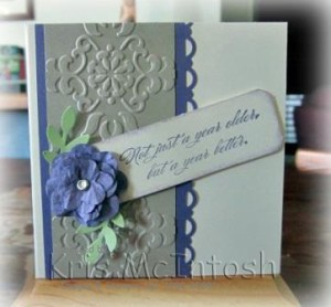 Of course then I had to make a card to match. This time I used Very Vanilla card with a layer of Perfect Plum card which is punched along one edge using the Scallop Trim Border Punch. I added a layer of Crumb Cake which has been embossed using the Vintage Wallpaper Embossing Folder. I stamped the greeting from the Bring on the Cake stampset using Perfect Plum ink onto Very Vanilla card. I rounded the corners and sponged with Perfect Plum ink. I added a flower and leaves made the same as the box. I really like the saying – it says “Not just a year older, but a year better”.