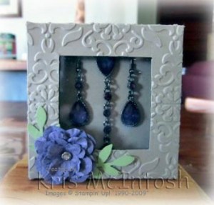 I purchased a necklace and matching earrings with the help of my daughter. I hope that the young lady in question likes them. However, the packaging was very ordinary and I thought I could create something much nicer. I made a basic 3″ square box from Crumb Cake cardstock. The lid has been cut from Crumb Cake cardstock as well and embossed with the Vintage Wallpaper embossing folder. I cut an opening in the lid and covered it with a piece of window sheet on the inside. I cut my flower using Perfect Plum cardstock and the Floral Fusion Sizzlit. I added a small Clear Rhinestone brad in the centre. I punched a couple of leaves from Certainly Celery card using the Two Step Bird Extra Large Punch.