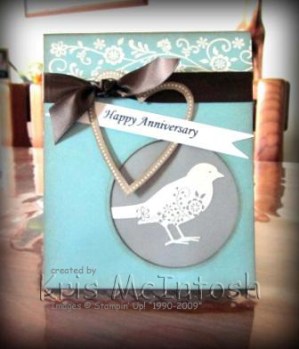 I made this card following a tutorial I purchased from Class in a Flash – if you haven’t had a look at these tutorials then you must because they are fabulous. The colours are Baja Breeze, Crumb Cake and Early Expresso. The stampset used is Always and it is perfect for this type of card. The bird is actually stamped onto Vellum cardstock using Versamark and then heat embossed using White embossing powder and mounted behind a cut-out window. The heart image was embossed onto Crumb Cake card using White embossing powder and then the centre of the heart was cut out, leaving this gorgeous frame. The Always in Bloom standard wheel was also used on the top section of the card, again wheeled using Versamark ink and embossed with White embossing powder. I used my computer to add the greeting to Whisper White card which is mounted over and under the heart frame. The border of the Early Expresso card is punched using the Scallop Trim Border punch and the ribbon is Early Expresso 5/8″ Satin.