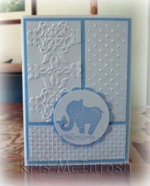 Kris, this card is adorable! Your background of mixed textures really sets the tone of a new nursery, ready for a baby. And the elephant in blue with the butterfly on his trunk seems to say “welcome” indeed!