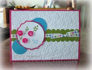 This card uses Melon Mambo as the base cardstock. I have added a layer of Whisper White which is embossed using the Petals-A-Plenty Embossing Folder. I added a layer of Old Olive cardstock which has both edges punched using the Scallop Edge Border punch. I also wrapped this with some of the gorgeous new ribbon and tied a knot. The ribbon is stamped with tiny flowers in Daffodil Delight, Melon Mambo, Old Olive and Pacific Point – gorgeous. I inked part of the vine image from Thoughts and Prayers using my Old Olive Stampin’ Write Marker and stamped onto a circle of Whisper White card. I didn’t add any ink to the flowers instead substituting the Melon Mambo buttons. I stamped “thank you” from the Silhouette Sentiments stampset using Pacific Point ink next to the vine image. I punched one edge of a long thin strip of Melon Mambo card with the Scallop Trim Border punch and attached it behind the image circle to frame it. I punched a 1 3/4″ circle and a 1″ circle from Pacific Point card and attached them behind the image circle and over the Old Olive panel.